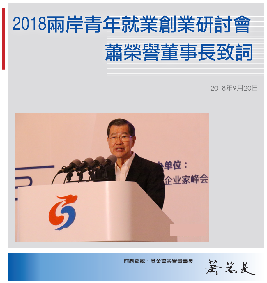 兩岸企業家峰會這一次選擇在台商聚集的江蘇昆山舉辦「 2018 兩岸青年就業創業研討會」, 獲得江蘇省政府、 昆山市政府、 大陸峰會和各有關方面的全力支持和協助, 同時也獲得許多來自兩岸各地的台灣青年朋友的熱情參與。 本人要代表台灣方面, 向促成此次研討會的各有關部門表達最誠摯的感謝, 同時也要向所有參加研討會的青年朋友們表達熱烈的歡迎之意。